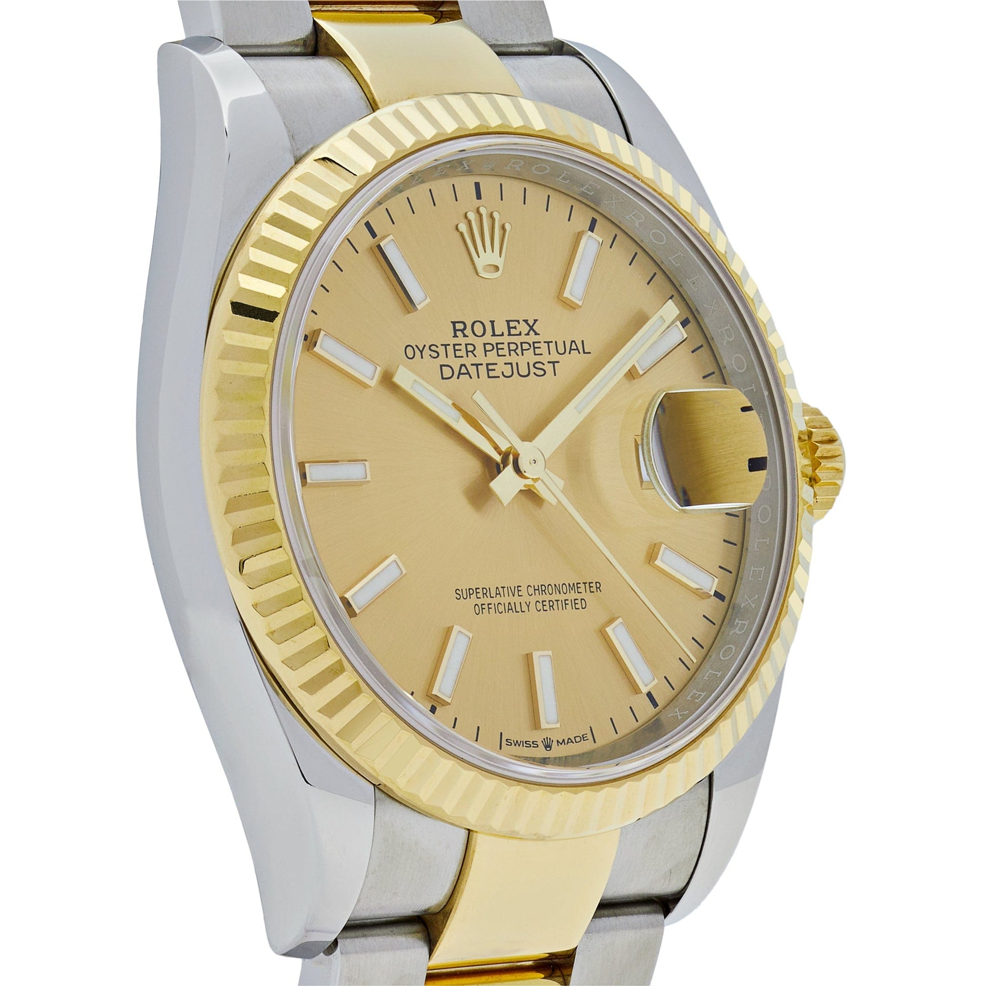 The 2025 Watch Datejust is designed with a 36mm?stainless steel case. highlighted?by the signature 18k?yellow?gold fluted bezel. and styled on a two-toned oyster bracelet. The champagne?dial hosts?a date feature at 3 o'clock. The 2025 Watch Datejust is a classic model and the next addition to your collection.?