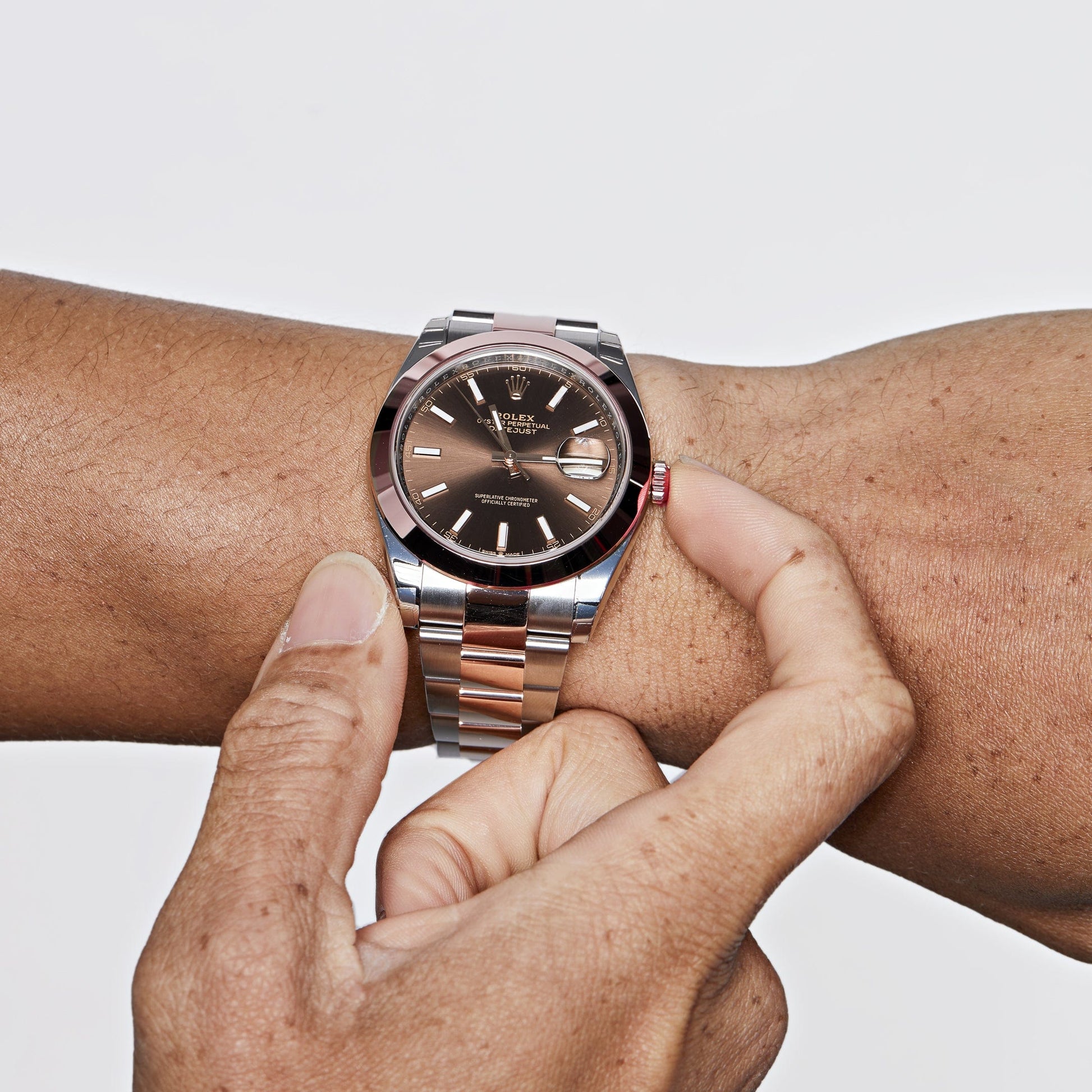 The 2025 Watch Datejust is designed with a 41mm two toned rose gold & stainless steel case. highlighted with a classical rose gold smooth bezel. It features a chocolate brown dial surrounded by luminous hands and a date display at 3 o'clock. protected by a scratch-resistant sapphire-crystal. On the wrist. the rose gold and stainless steel jubilee bracelet is a true beauty.