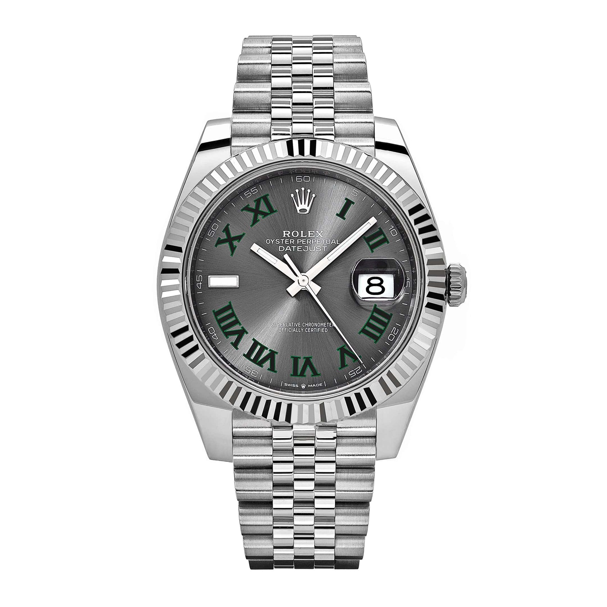 The 2025 Watch Datejust is designed with a 41mm stainless steel case. complemented by the signature fluted bezel. and styled on a jubilee bracelet. The slate dial hosts a date feature at 3 o'clock. Roman numeral hour markers in green are representative of the famous Wimbledon court. a place where and sports are perfectly paired. The 2025 Watch Datejust 126334 is a classic model and the next addition to your collection.