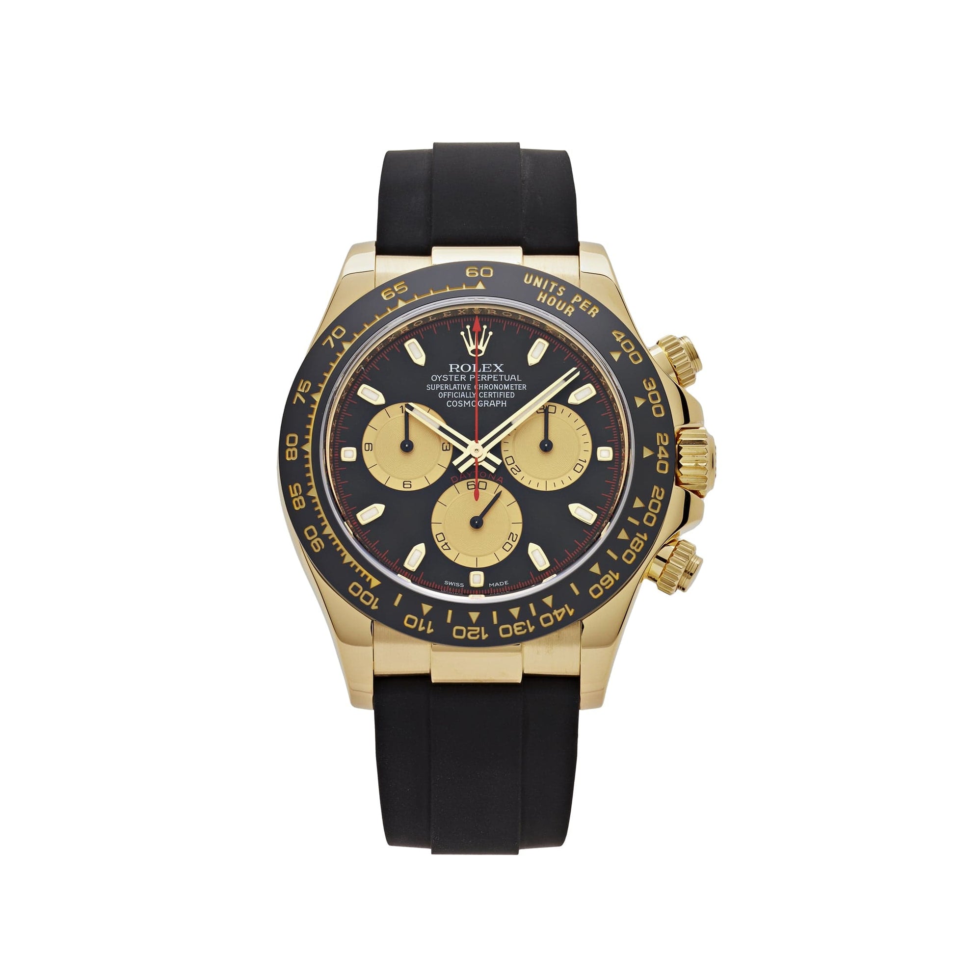 This 2025 Watch Daytona 116518LN is designed in a 40mm 18k yellow gold case. a black bezel featuring a Tachymetric scale. and a black dial with gold sub-dials. The hour markers and hands work with Chromalight display to provide optimal legibility. It is housed on a black rubber strap with a folding clasp.?