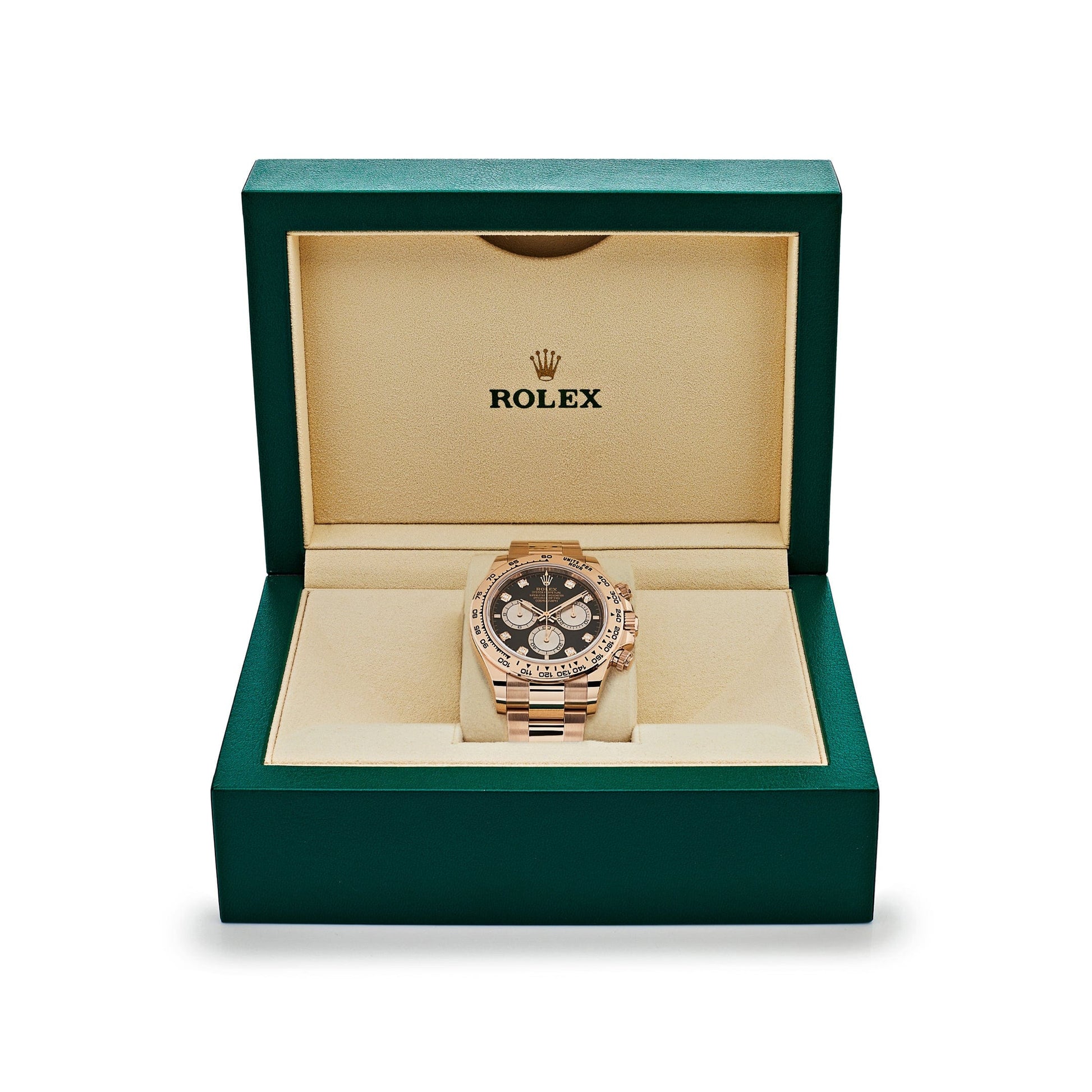 The 2025 Watch Daytona 126505 is designed in 40mm 18k rose gold with a black dial. Diamond hour markers and luminous hands include a?Chromalight?display for optimal legibility. The bezel is engraved with a tachymetric scale and hosts the high-performance Cosmograph complication. This Daytona Cosmograph bridges the gap between form. functionality. and fashion.?