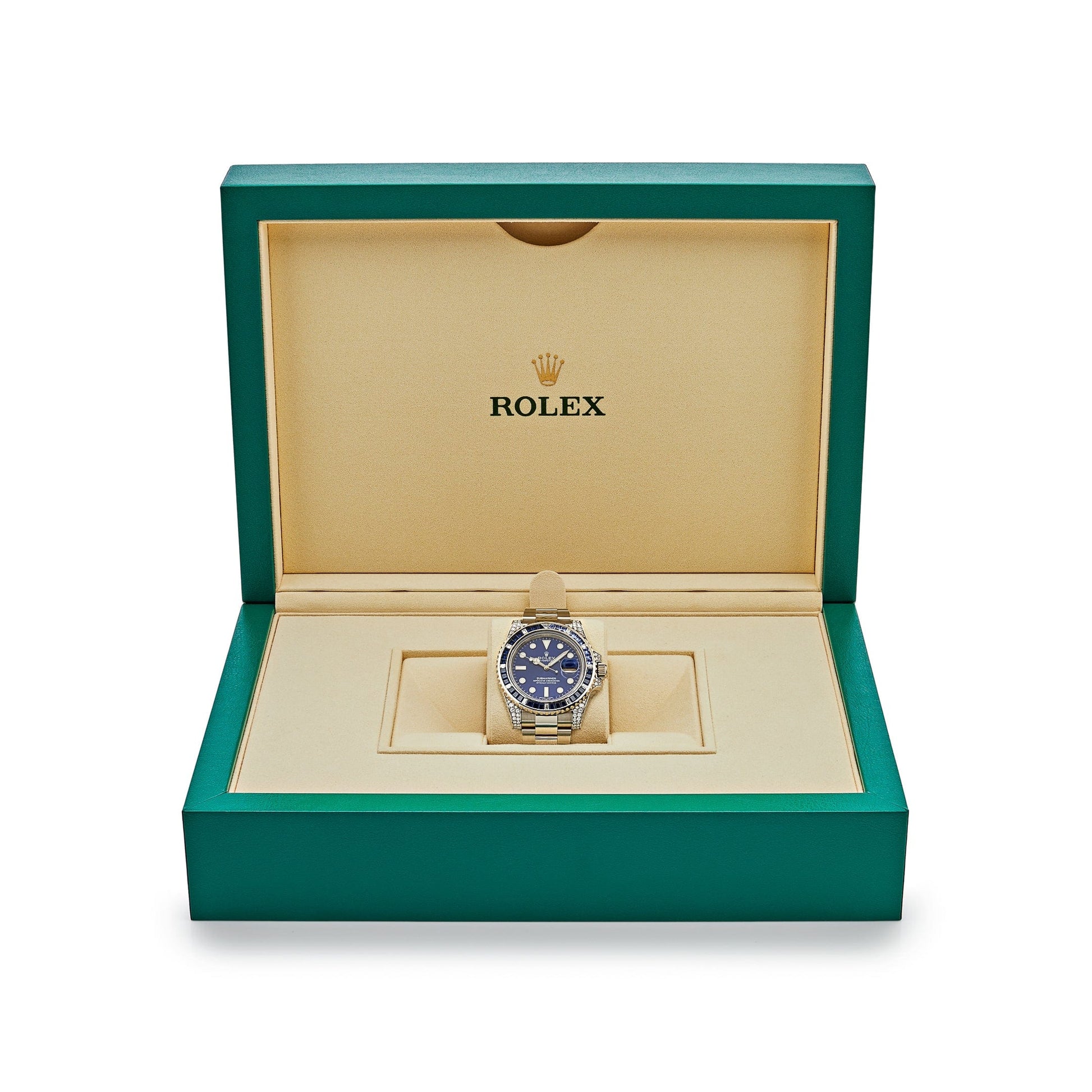 The 2025 Watch Submariner Date is designed in a 40mm 18k white gold case. blue dial. blue gem-set bezel. and styled on a white gold Oyster bracelet. Dark blue sapphires and diamonds cover the bezel and lugs. Luminous hour markers and hands make it easy to read in any condition -? so you can wear this beauty from dawn to dusk.